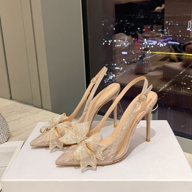 一字带高跟鞋包头镂空凉鞋女细跟2023年夏季新款尖头网纱水钻女鞋