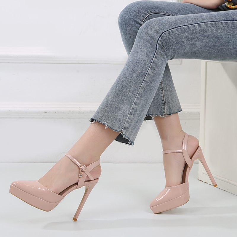 12cm包头尖头超高跟鞋防水台细跟一字扣带后空凉鞋女夏季13cm性感