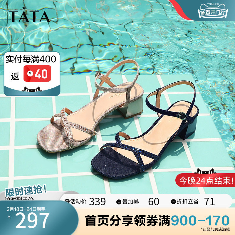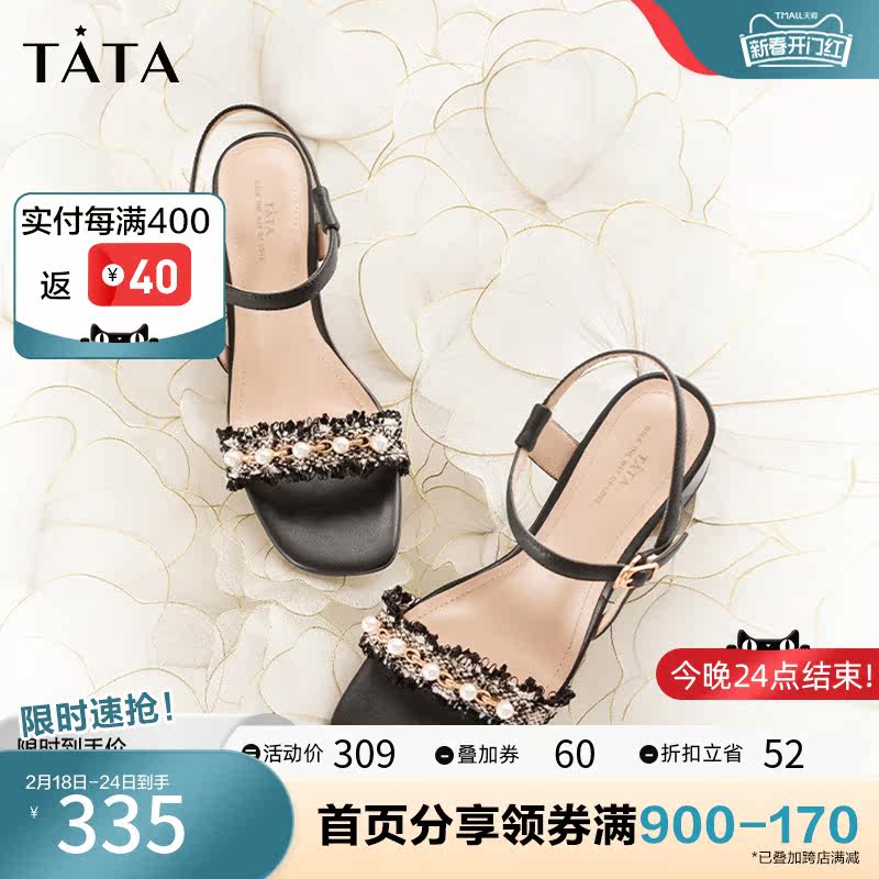 Tata他她一字带小香风粗跟凉鞋女夏法式仙女高跟鞋新奥莱3LR02BL2