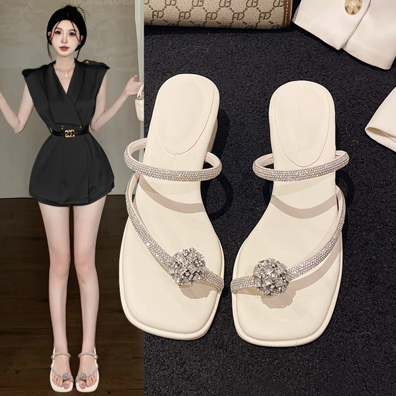 法式粗跟拖鞋女夏外穿2024新款鸽子蛋水钻凉拖鞋百搭夹趾罗马凉鞋