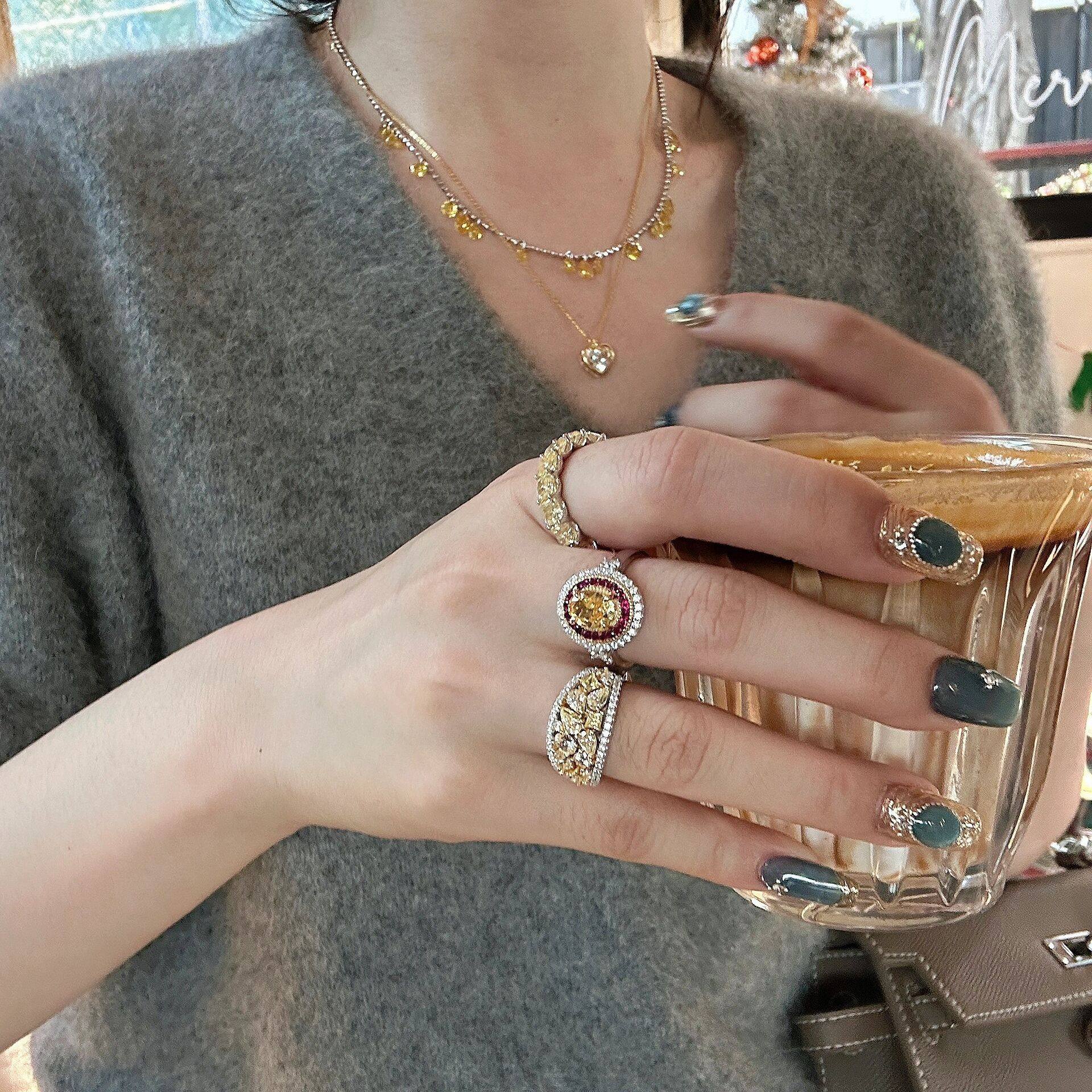 S925纯银微镶高碳钻轻奢排钻满圈戒指宫廷中古招财黄钻鸽子蛋指环
