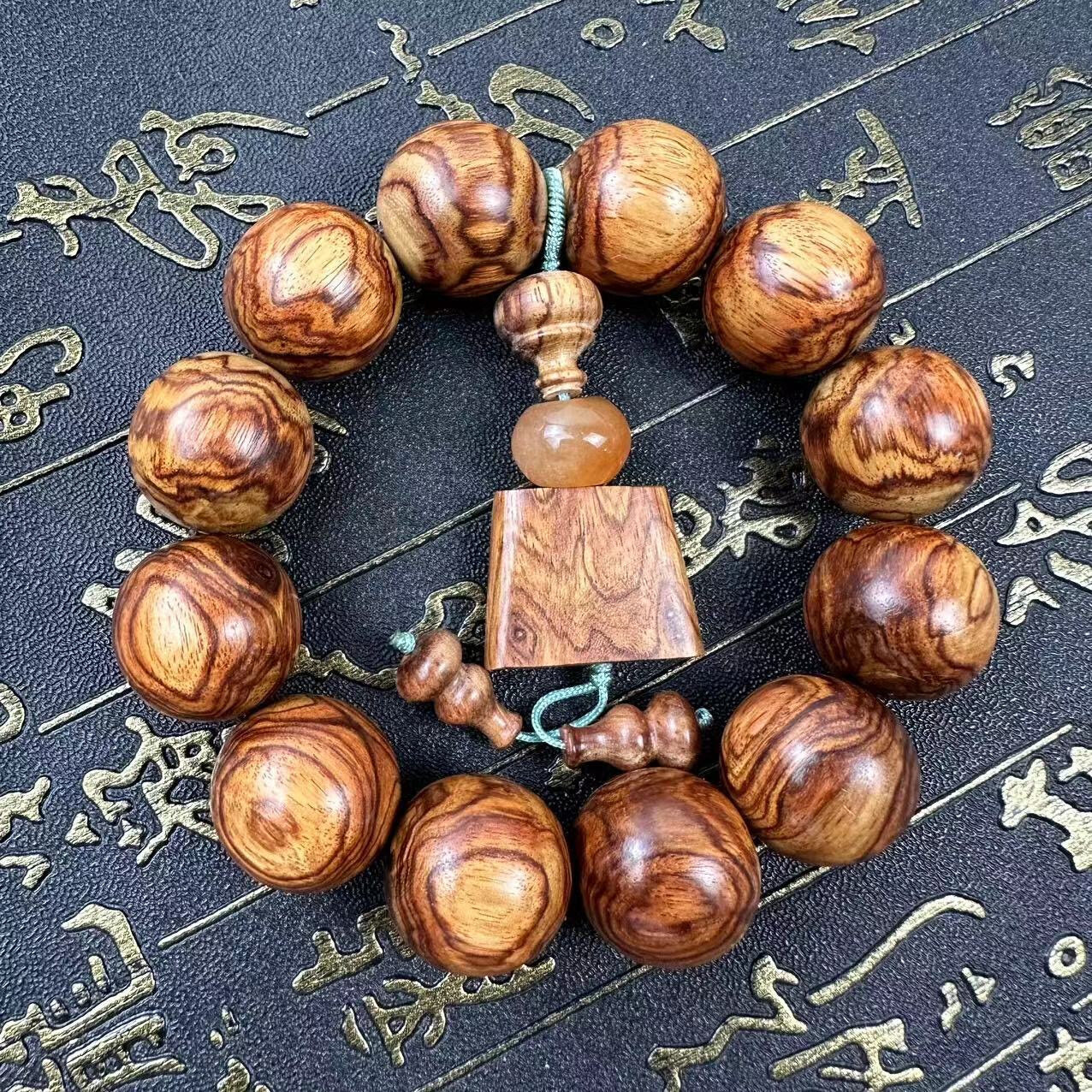黄花梨原木稀有老料佛珠手持念珠满皮虎纹高密度文玩手串男款手链