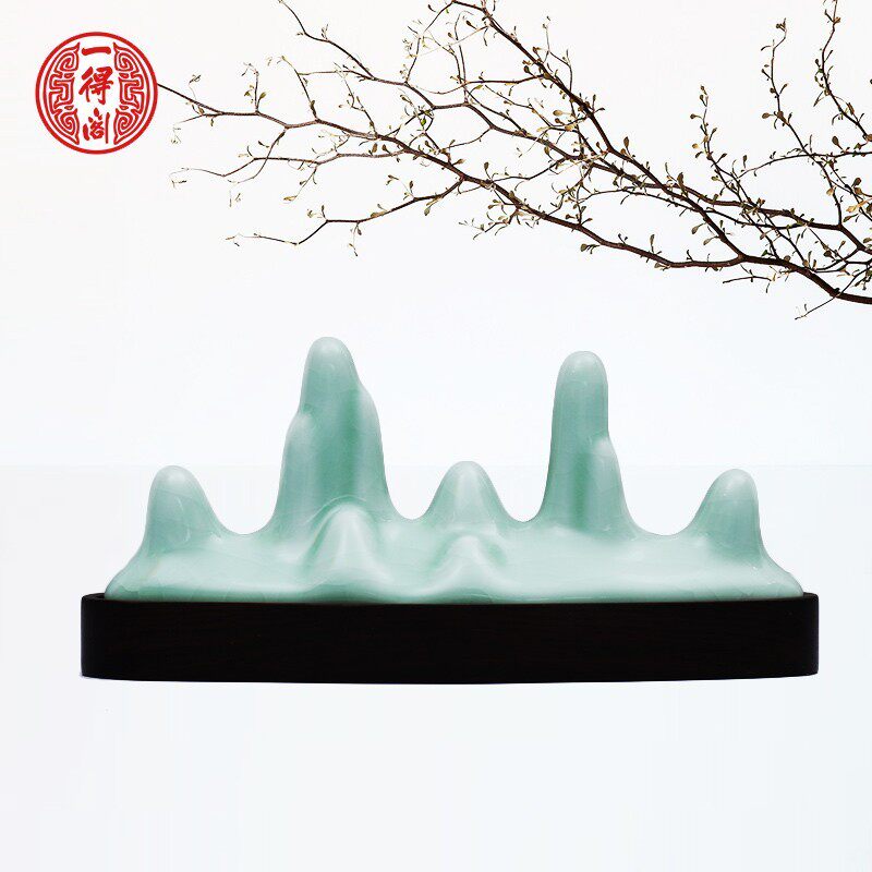 一得阁陶瓷创意笔架山毛笔搁豆青色文房四宝摆件 仿古汝窑五指山笔搁书法国画书法文房专用用具