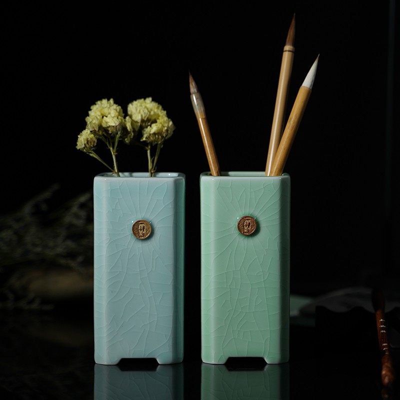 一得阁瓷器冰裂开片釉笔筒手工毛笔陶瓷笔筒创意多功能笔罐陶瓷青瓷大号文房四宝摆件办公文房用品简约