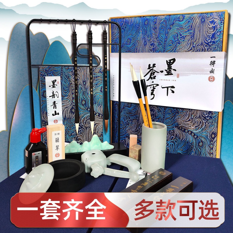 一得阁毛笔套装初学者入门练字羊毫兼毫毛笔学生毛毡砚台镇纸精品墨汁大中小白云高档书法练习纸文房四宝包邮