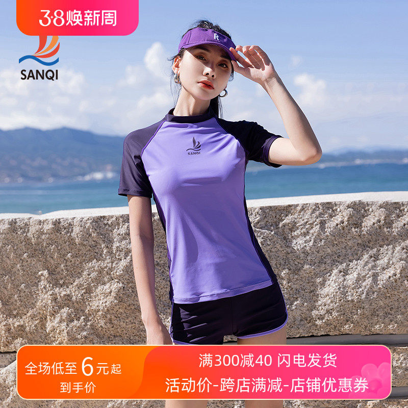 三奇泳衣女分体平角保守比基尼时尚纯色简约运动款短袖专业游泳装