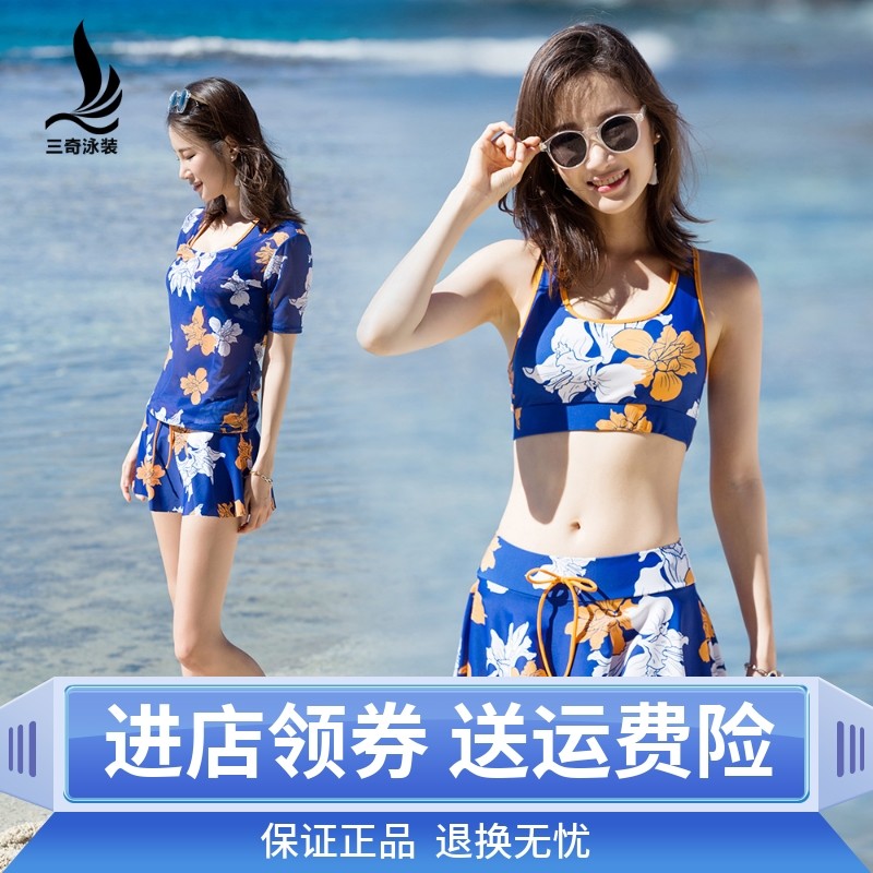 三奇游泳衣女三件套分体平角罩衫韩国保守显瘦小胸聚拢运动比基尼
