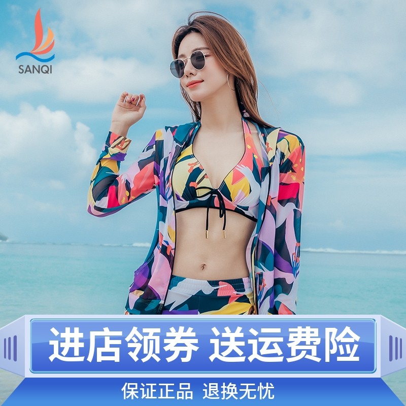 三奇保守分体泳衣女2023新款长袖防晒罩衫性感比基尼三件套游泳衣