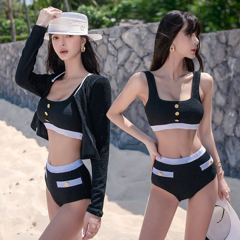 三奇小香风分体泳衣女2024新款长袖罩衫三件套温泉度假性感比基尼