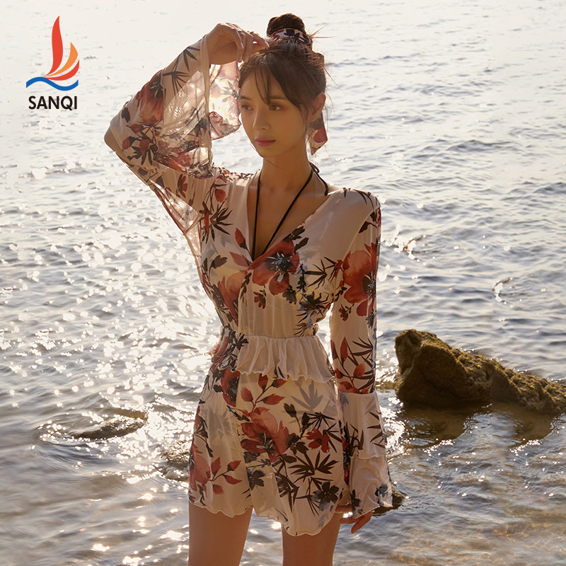 三奇2023新款性感分体泳衣女长袖泡温泉海边度假四件套比基尼泳装