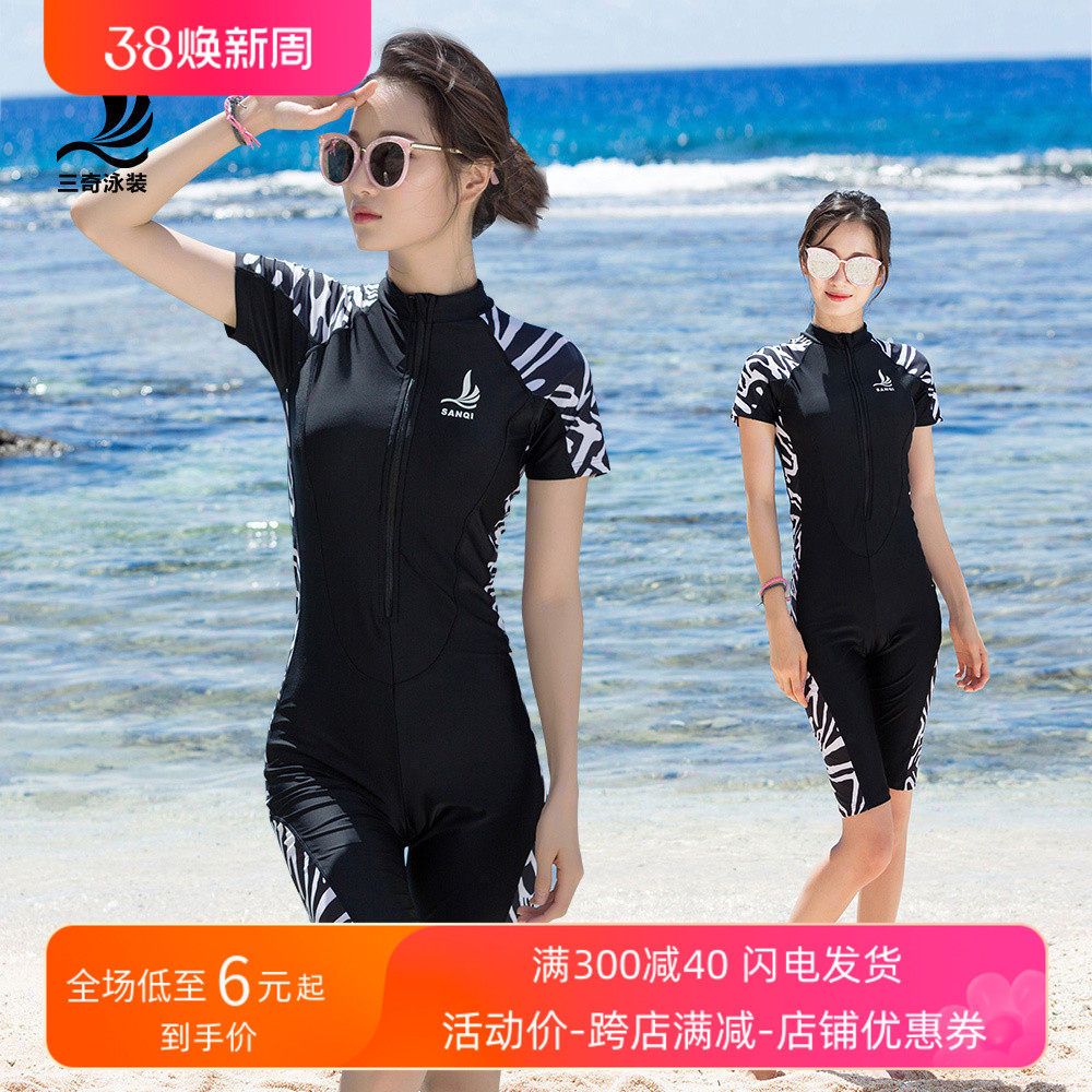 三奇游泳衣女士保守连体修身平角短袖专业潜水冲浪服显瘦运动泳装