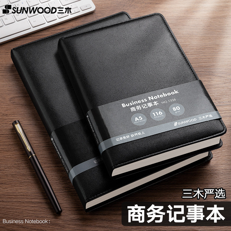 三木笔记本本子商务高档记事本加厚a5工作办公用会议记录皮面硬皮硬壳皮质加大实验日记记账高端黑皮精致高级