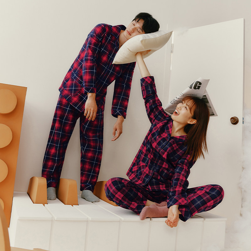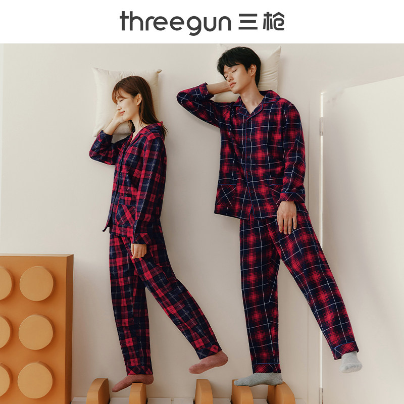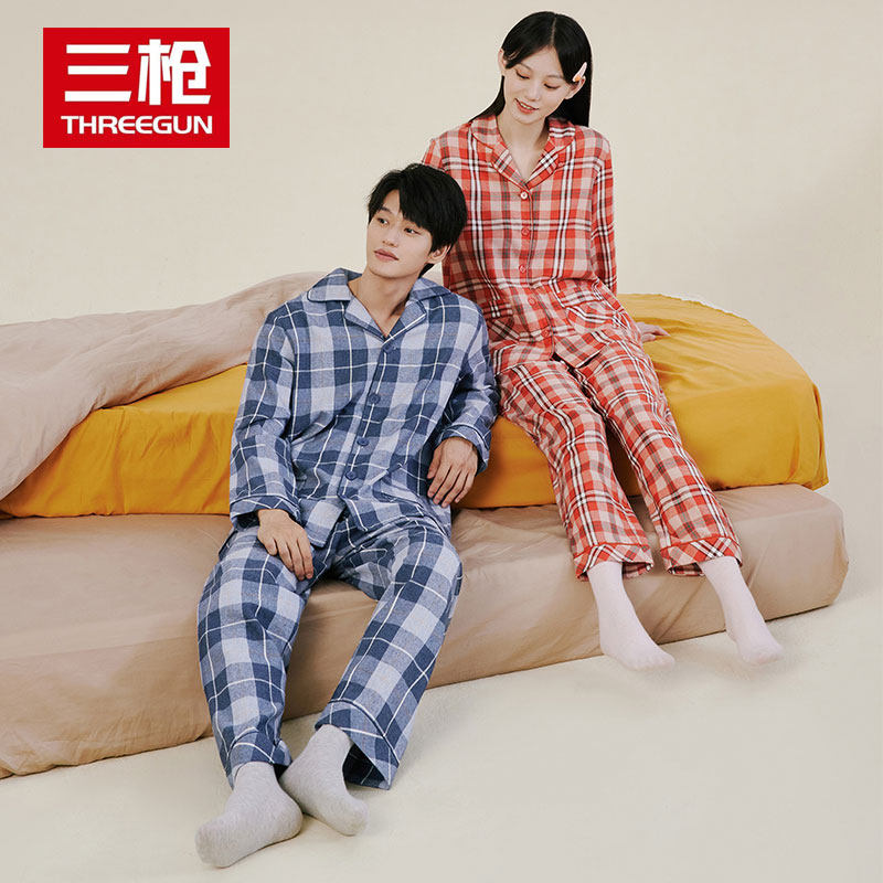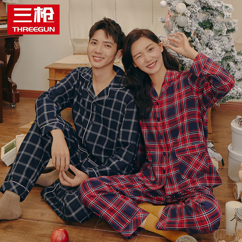 三枪睡衣男士秋冬纯棉彩格绒布翻领女士长袖起居服情侣款家居服