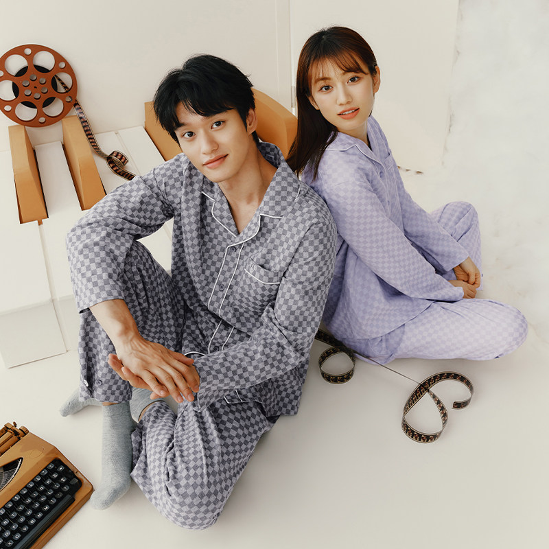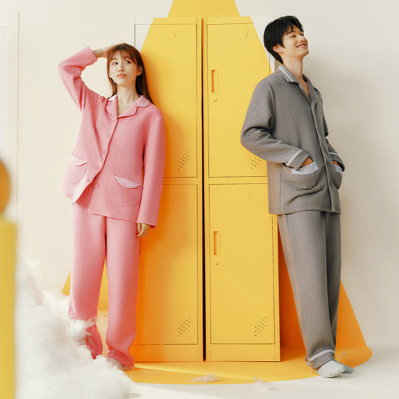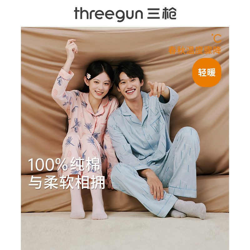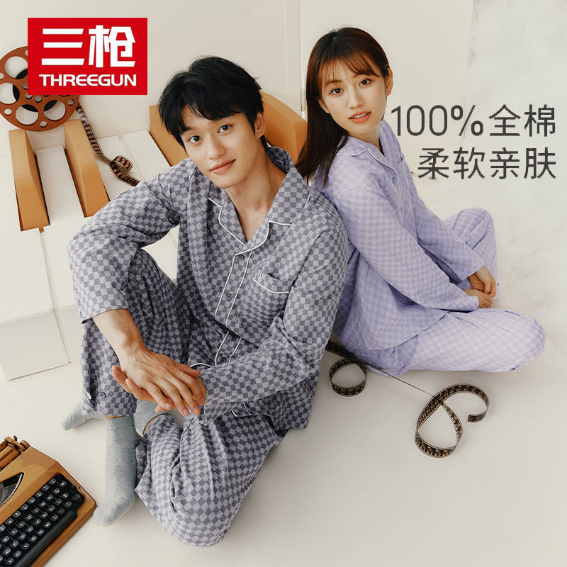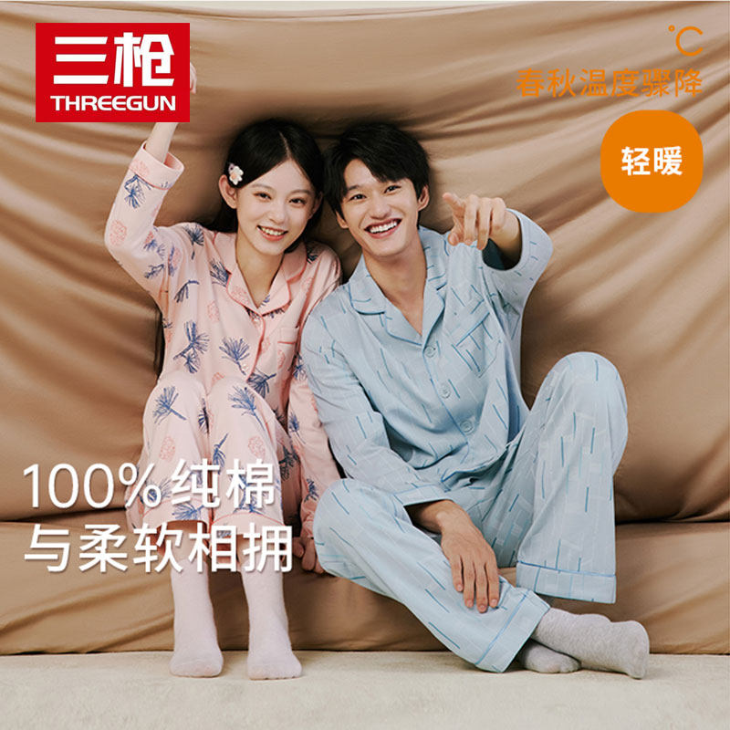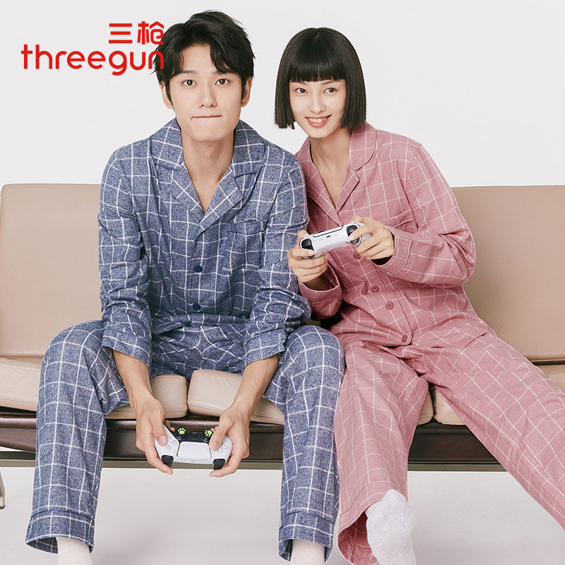 三枪全棉家居服套男女秋冬翻领开襟纯棉高级感女士睡衣套装情侣款