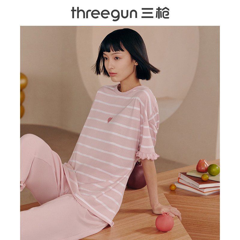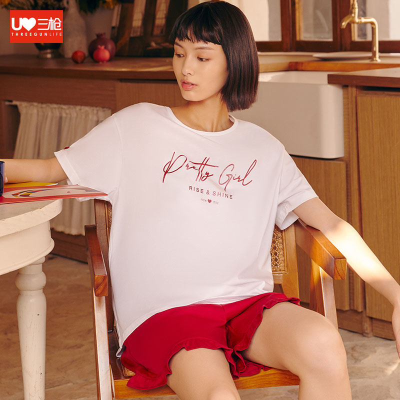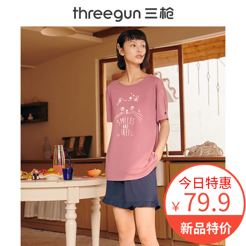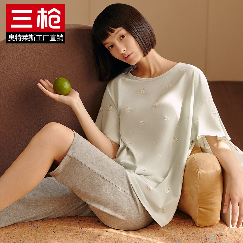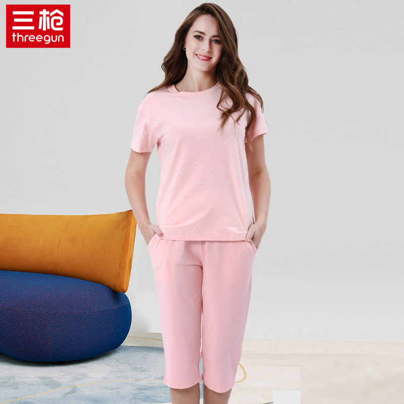 三枪女士夏季新款短袖圆领纯棉睡衣可外穿全棉休闲家居服印花T恤