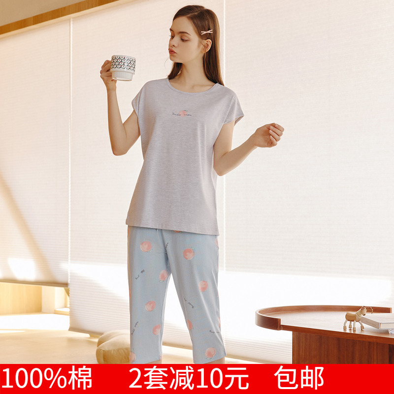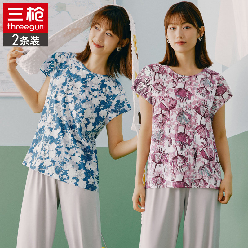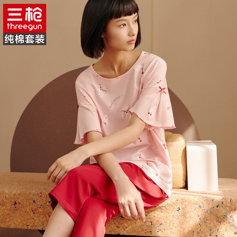 三枪套装 100%纯棉薄款女士家居服 夏季全棉甜美印花短袖长裤睡衣