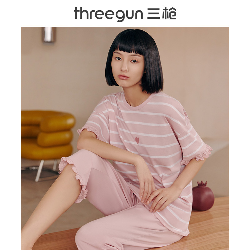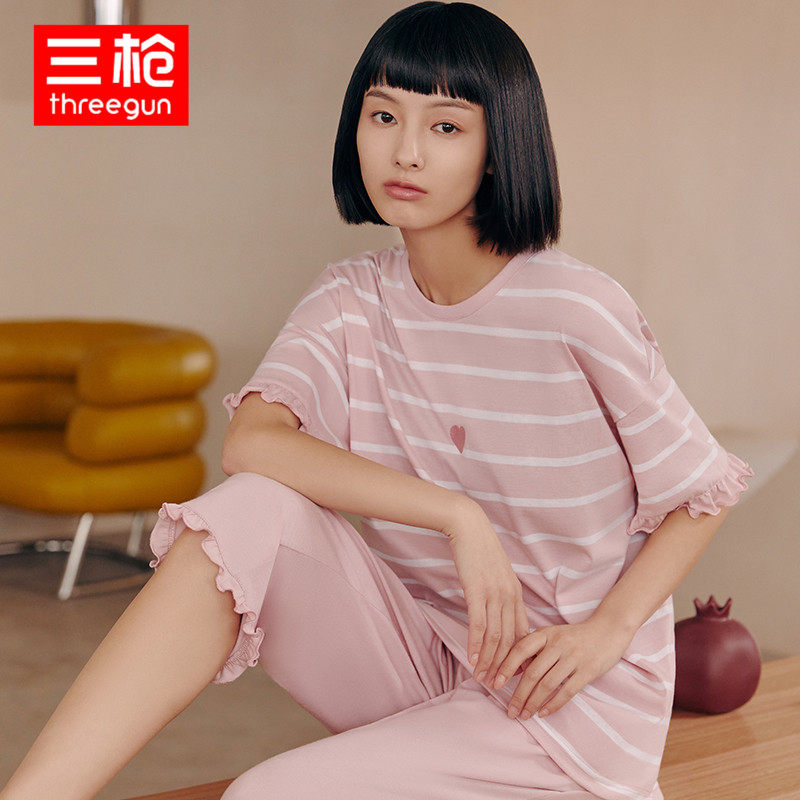三枪睡衣女夏春秋新款纯棉条纹居家甜美宽松女士短袖家居服套装