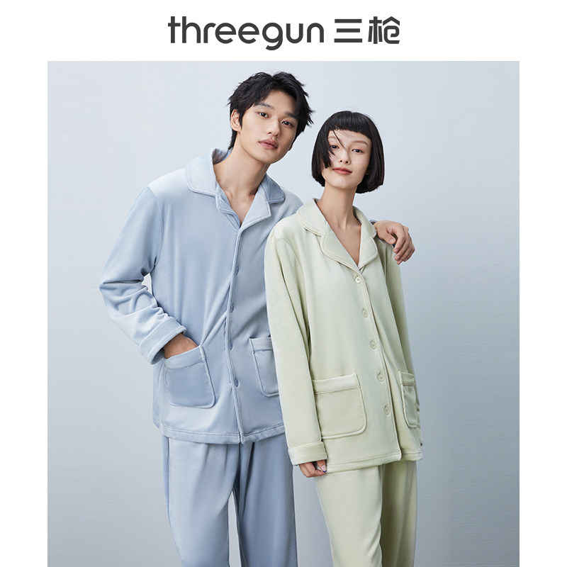 三枪秋冬新款女士睡衣全棉加厚保暖开襟翻领可外穿家居服男款套装