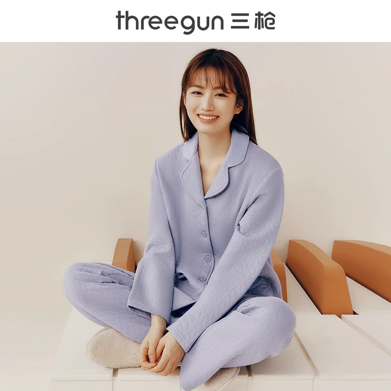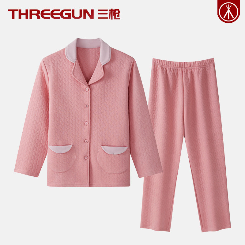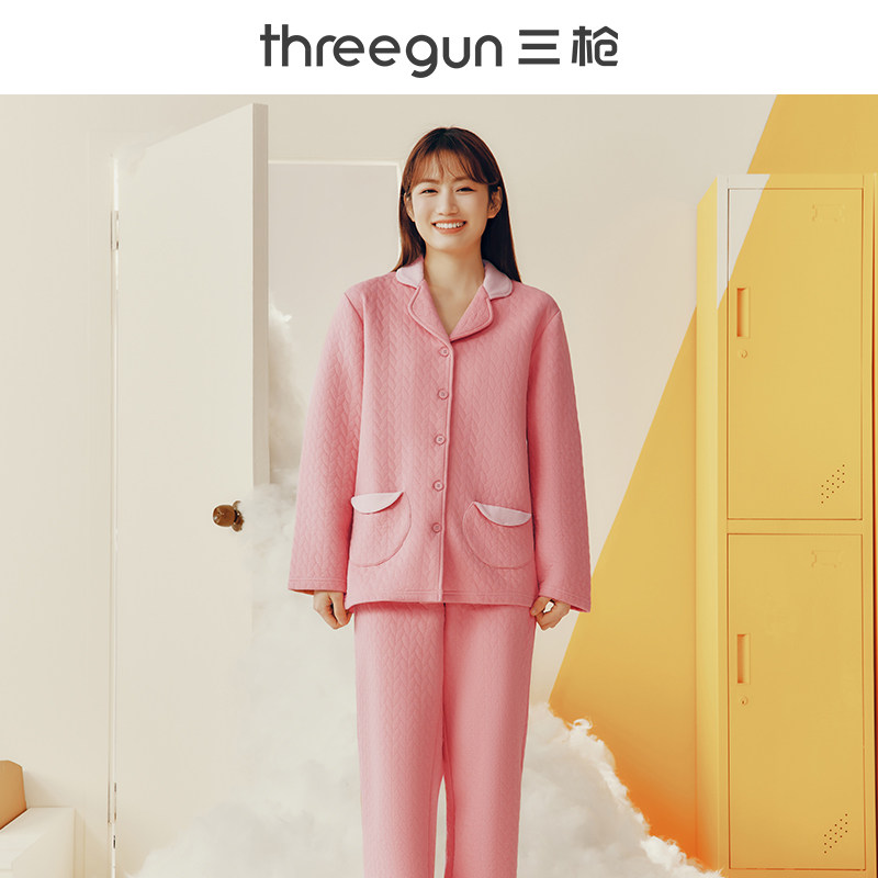 三枪睡衣套装 全棉薄夹棉加棉可外穿男女士秋冬季三层保暖家居服