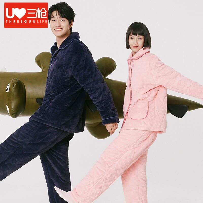 三枪中厚款夹绒情侣纯棉女士睡衣套装男士居家服全棉青年家居服冬