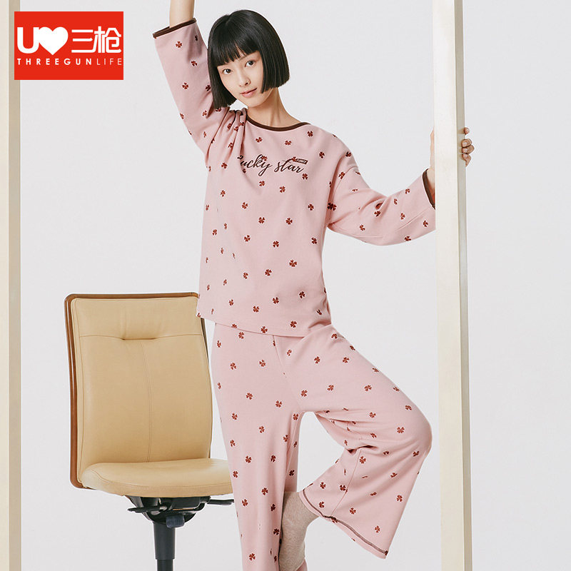 三枪家居套女秋季新品四叶草甜美印花九分袖纯棉女士睡衣套装