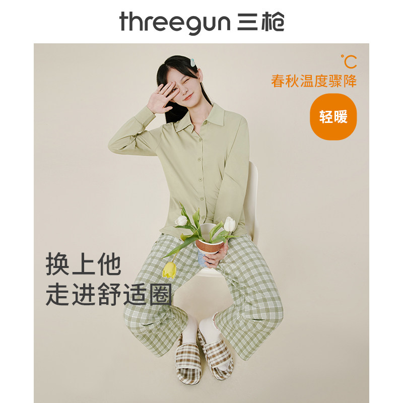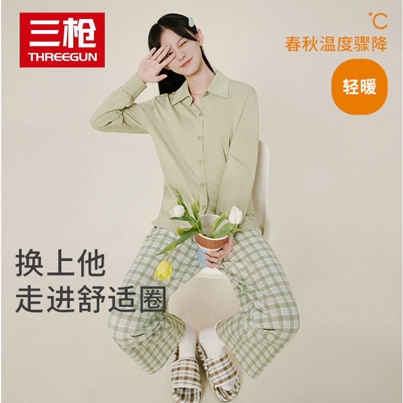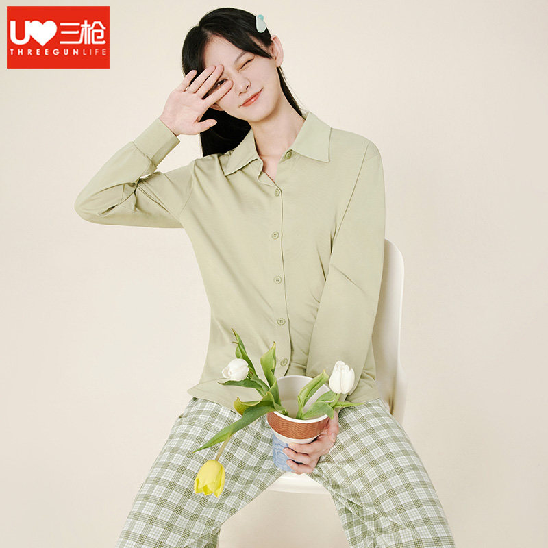 三枪舒感棉女士睡衣秋季新品格纹吸湿透气可外穿衬衫女家居服套装
