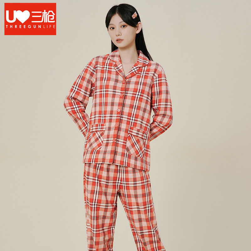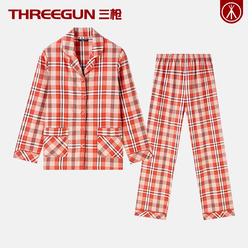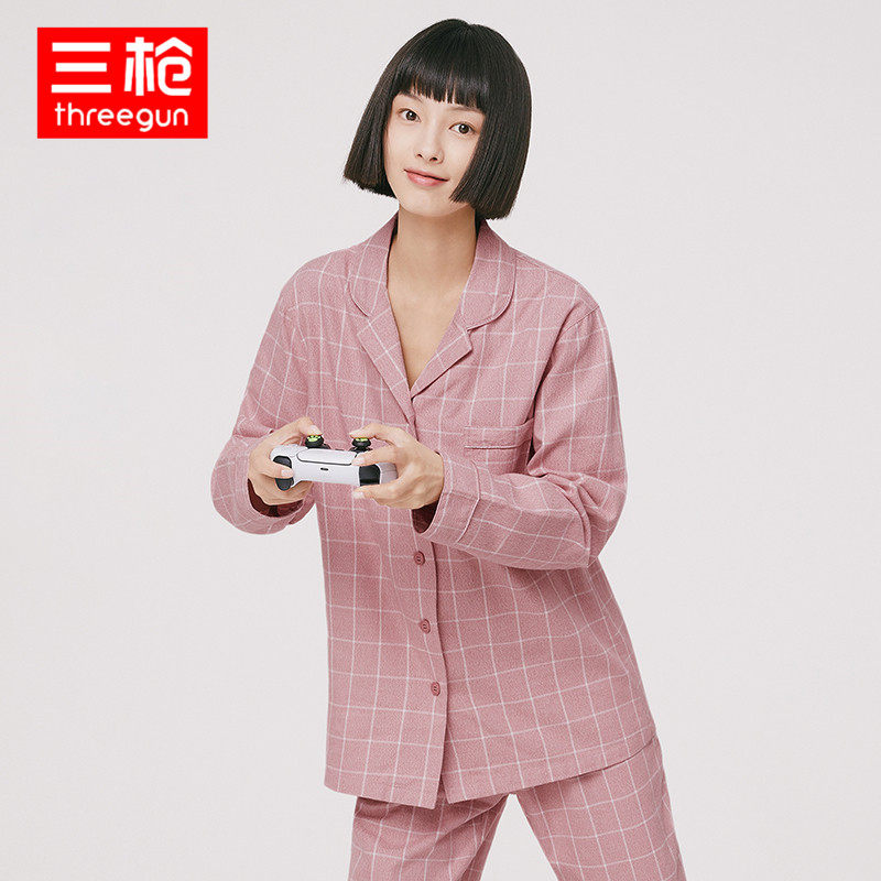 三枪女士睡衣秋季新品格纹吸湿透气舒感棉可外穿衬衫女家居服套装