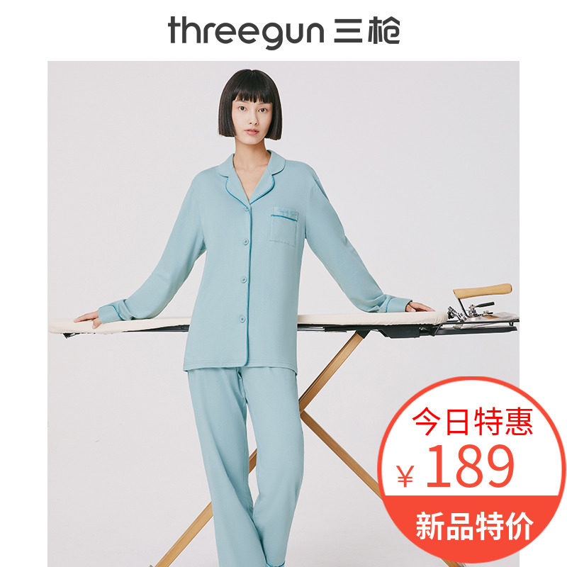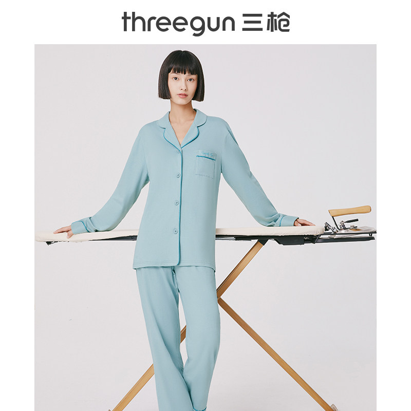三枪睡衣女春秋纯棉长袖翻领女士全棉两件套可外穿大码家居服套装