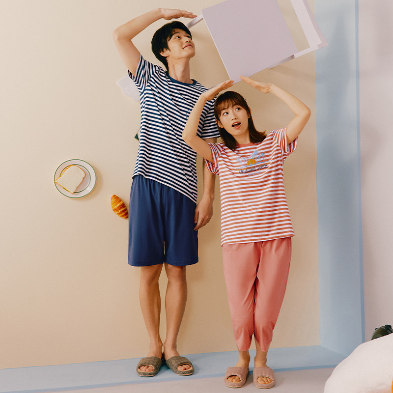 三枪 100%纯棉薄款家居服 全棉春夏季条纹短袖短裤男女士睡衣套装