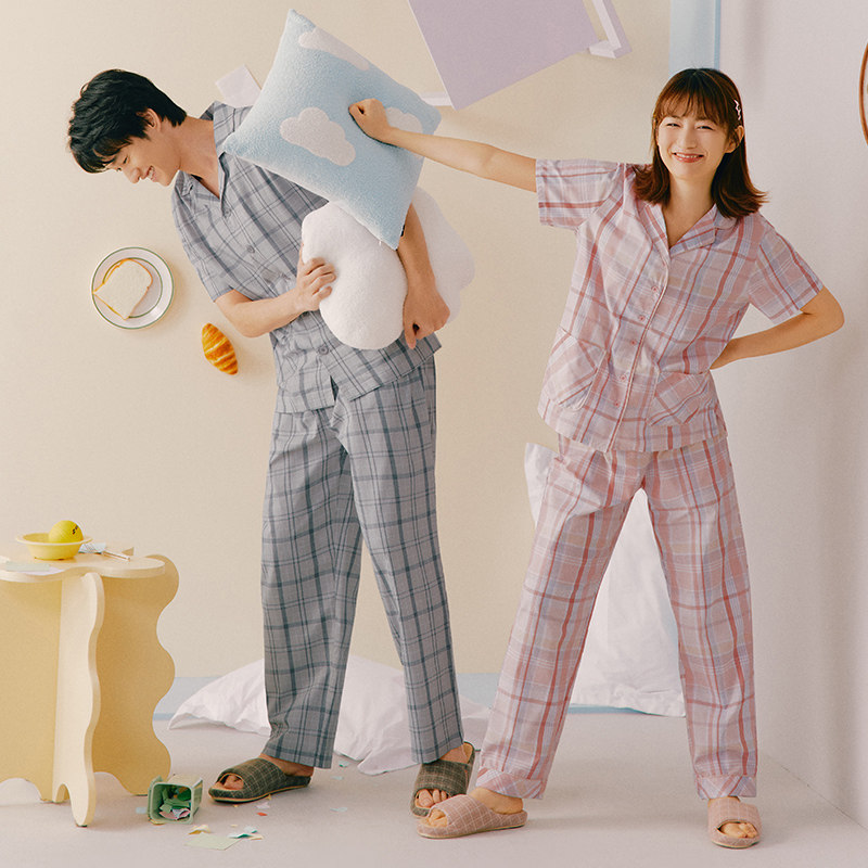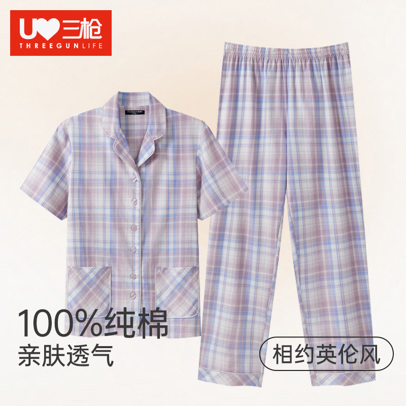 三枪睡衣纯棉家居服套装女士2024春夏新款格子短袖长裤薄款可外穿