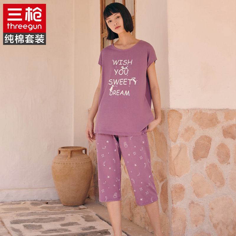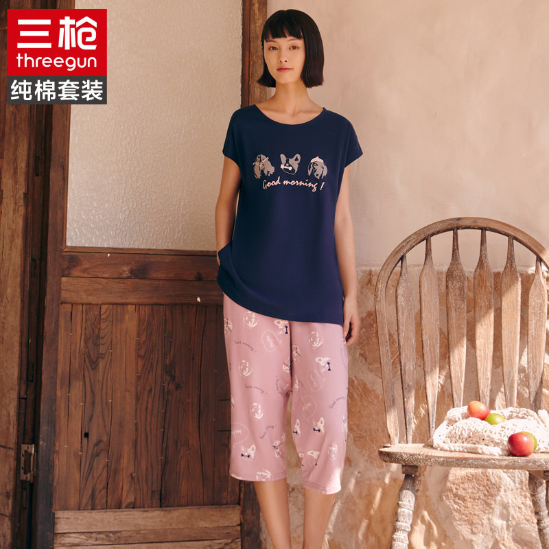 三枪睡衣女纯棉春夏运动休闲宽松印花短袖中裤居家套装家居服女士