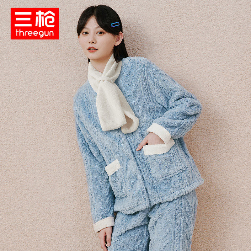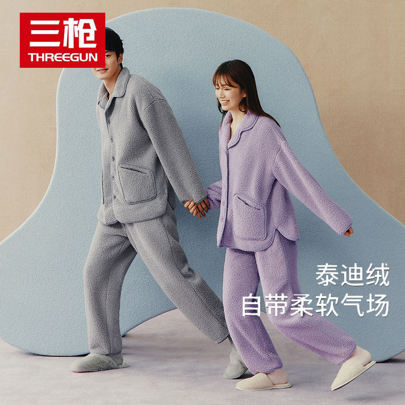 三枪男女士睡衣睡裤2023秋冬新品泰迪绒开襟加绒加厚情侣家居套装