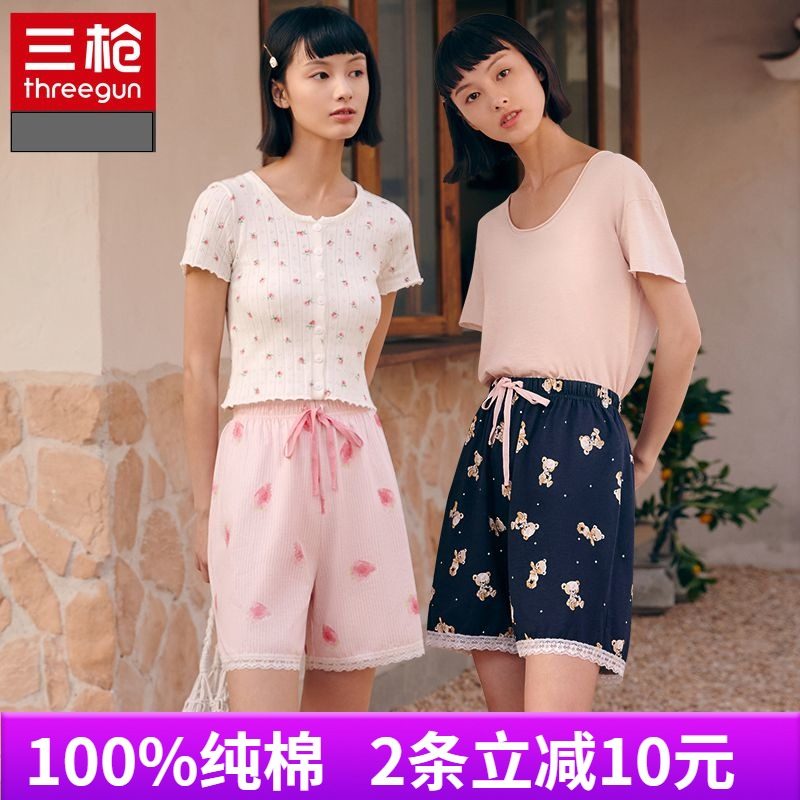 三枪新疆棉家居裤纯棉居家夏季新睡衣印花系带全棉女士花边短睡裤