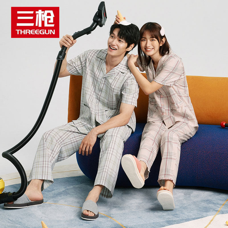 三枪家居服套装 100%纯棉超薄款男女士春夏全棉短袖长裤干爽睡衣