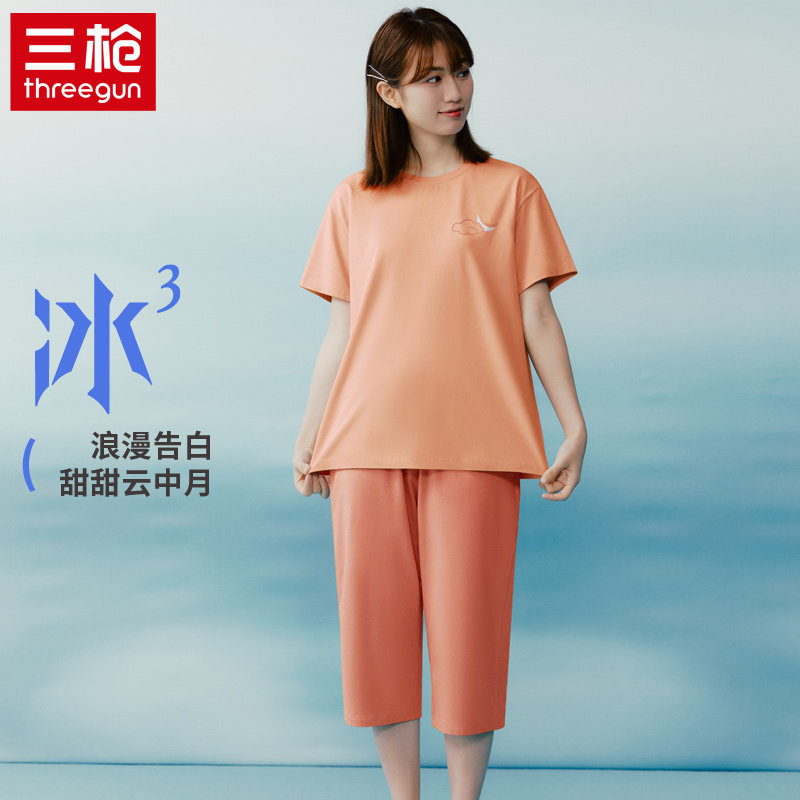 三枪冰立方弹力棉短袖凉感夏季宽松女士睡衣五分裤套装薄款两件套