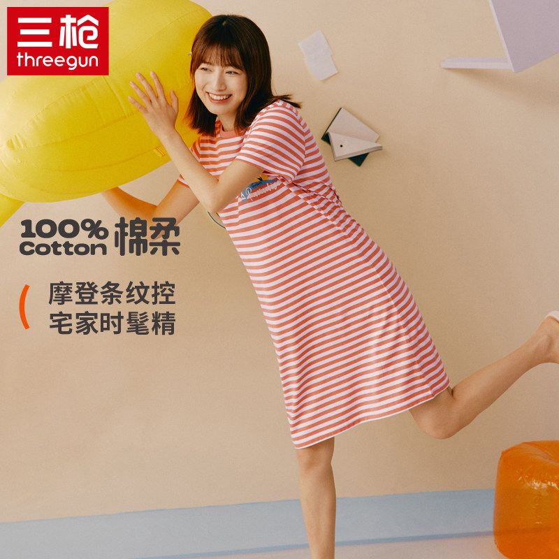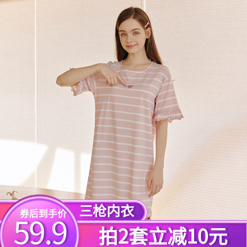 三枪女士夏天新款短袖条纹纯棉睡裙宽松休闲可外穿全棉睡衣家居服