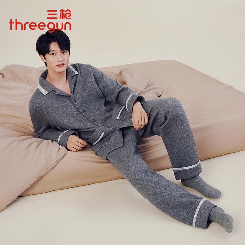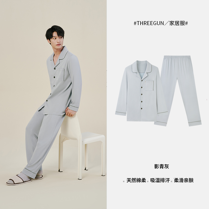 三枪睡衣男秋季水柔棉翻领开襟男士长袖家居服套装长袖起居服