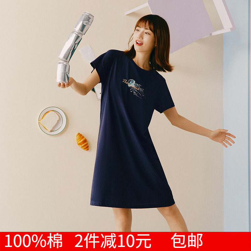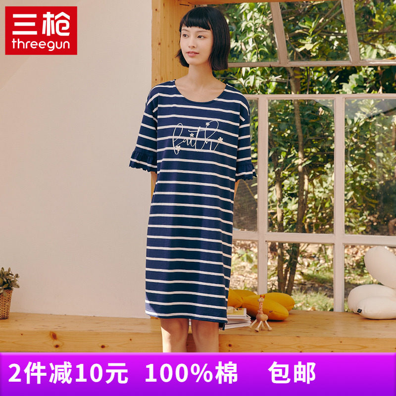 三枪女睡裙睡衣纯棉春夏条纹薄圆领短袖印花水柔棉家居裙