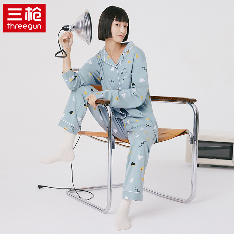 三枪开门襟家居服男女秋季纯棉印花大码宽松舒适全棉长袖睡衣套装