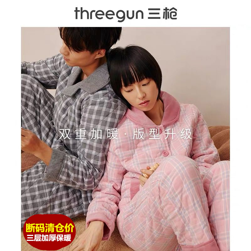 三枪睡衣三层夹棉加厚男居家服纯棉加绒女棉袄开襟格子情侣家居服