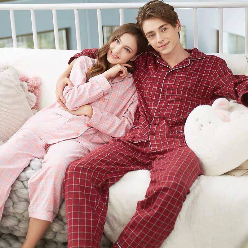 2件套 三枪纯棉格子睡衣睡裤套装情侣男女春秋磨毛格纹开襟家居服