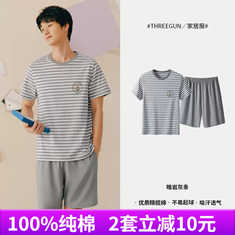 三枪睡衣男夏季新品纯棉条纹圆领短袖短裤家居服套装全棉睡衣