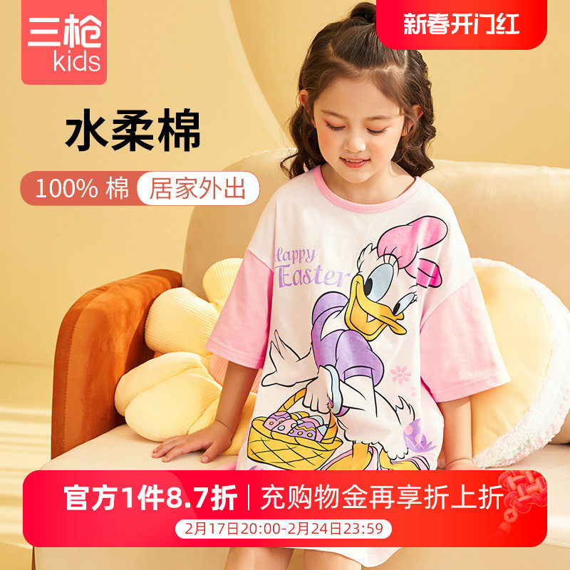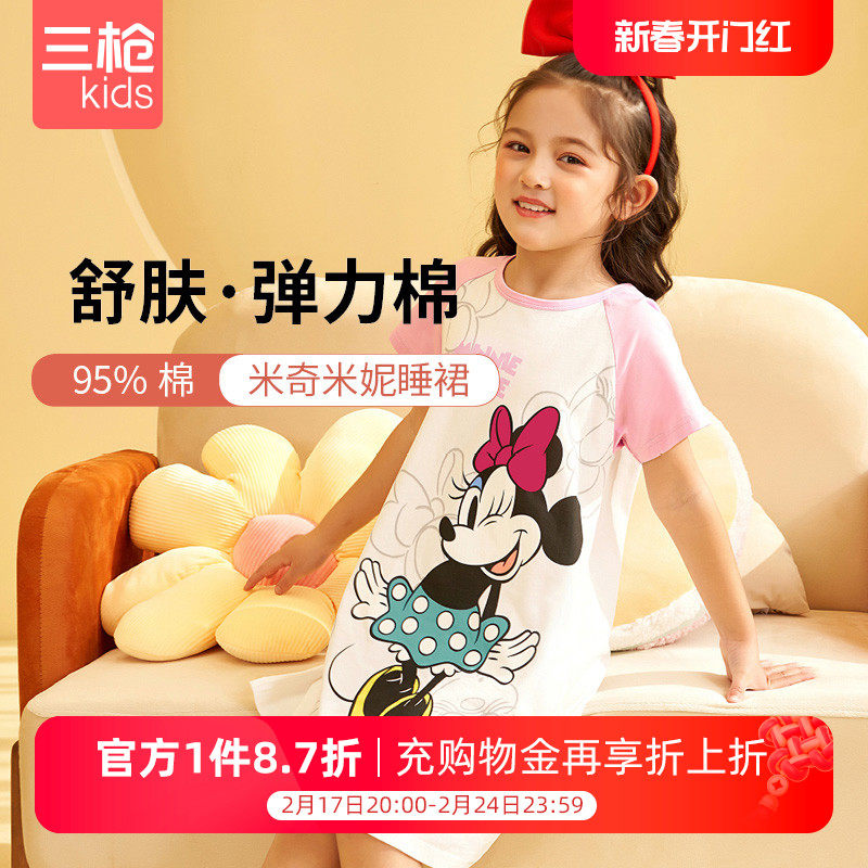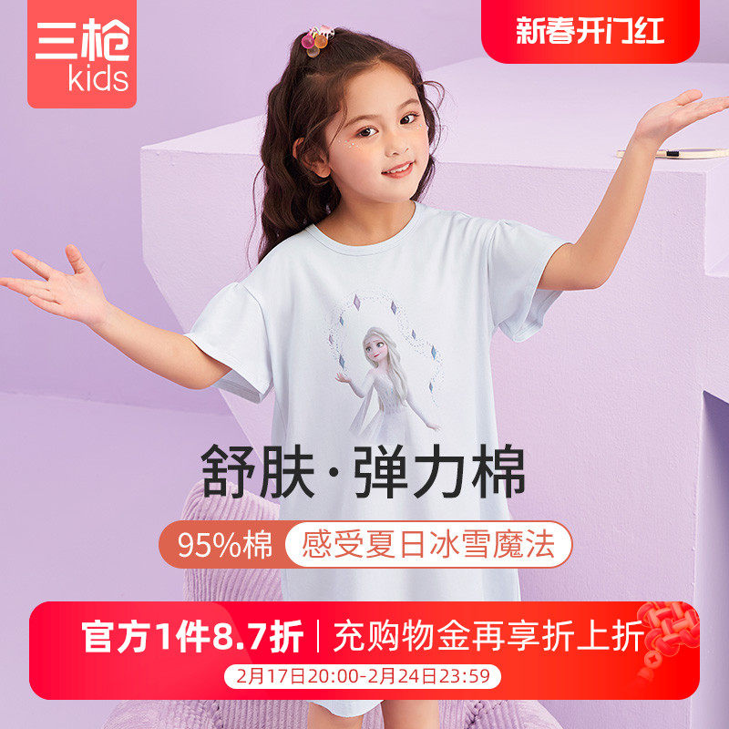 三枪儿童睡裙女童睡衣迪士尼卡通纯棉家居服少女中大童短袖睡裙