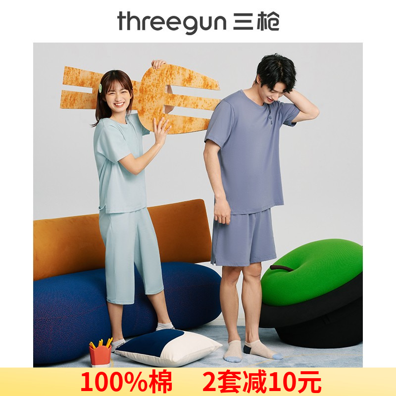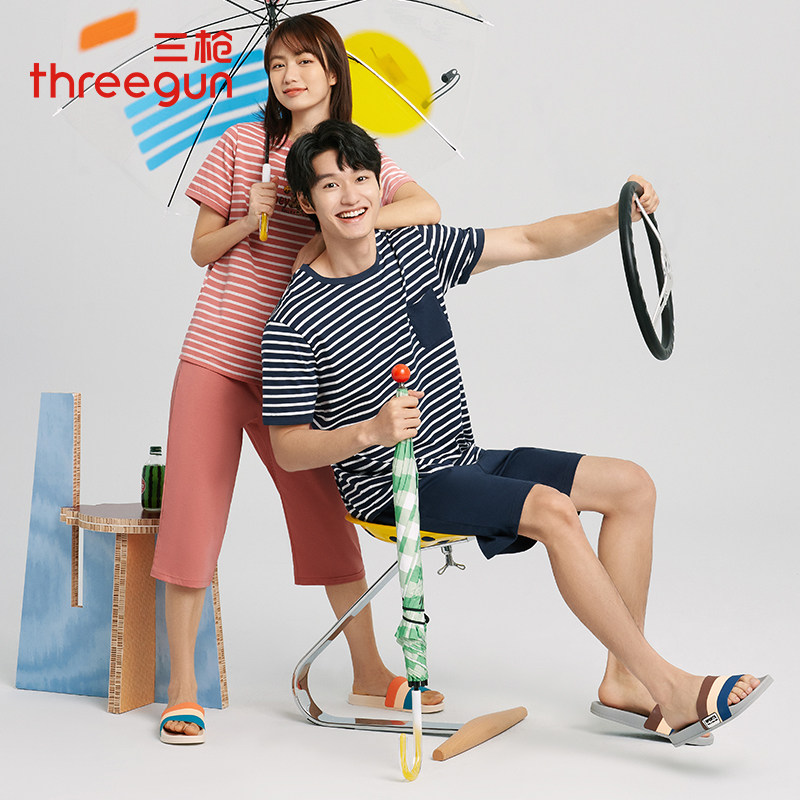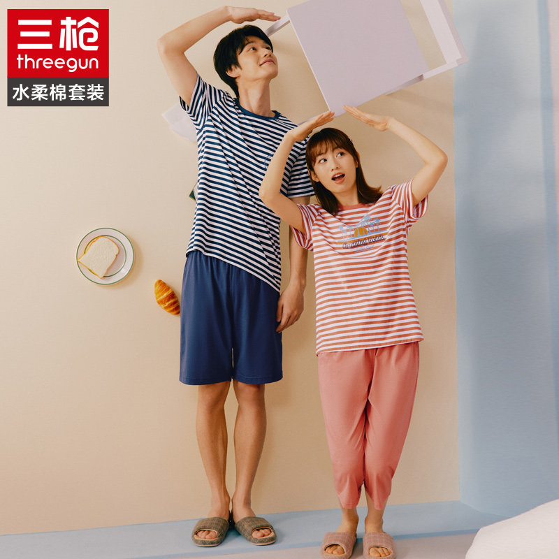 三枪睡衣女2022年新款水柔棉圆领短袖条纹家居服套男士起居服情侣