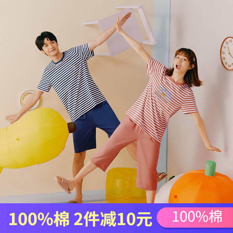 三枪夏款男女纯棉条纹家居服套装圆领情侣短袖短裤夏季睡衣两件套