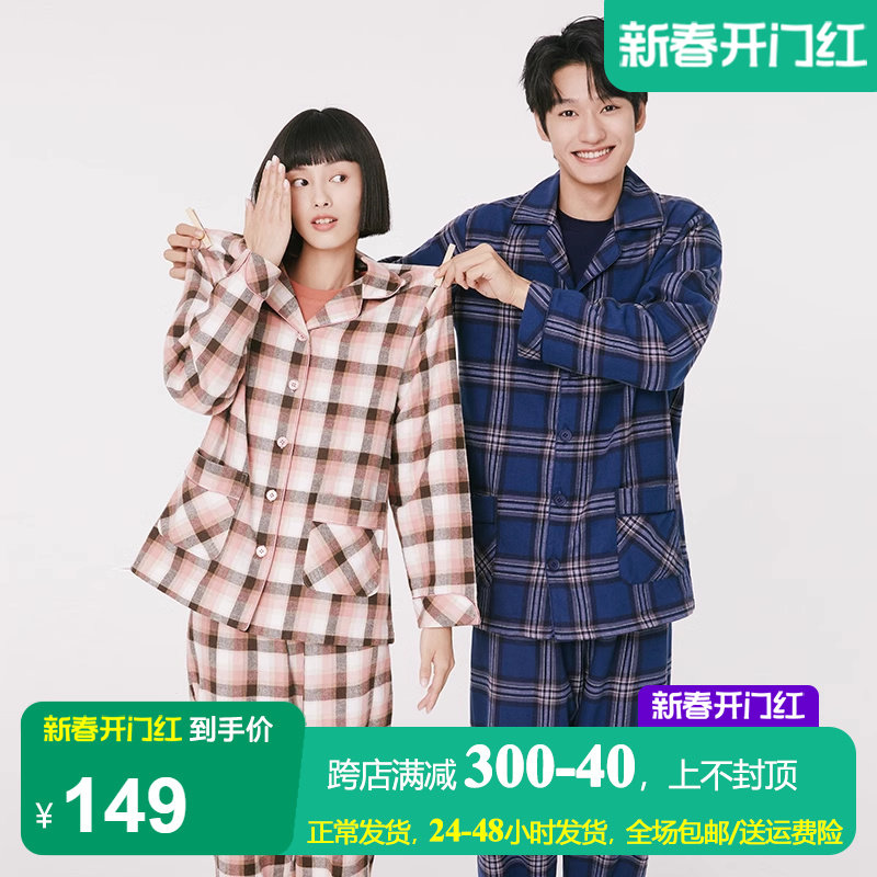 三枪睡衣男士秋冬纯棉彩格绒布翻领女士长袖起居服情侣款家居服
