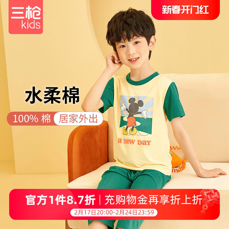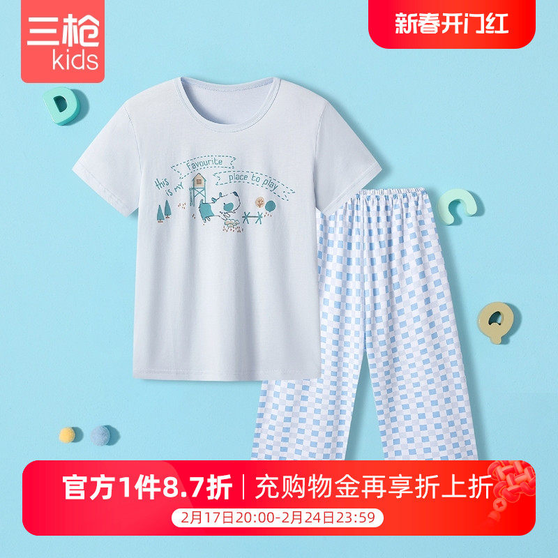 三枪男童家居服纯棉男孩居家睡衣水柔棉男童圆领短袖中裤家居套