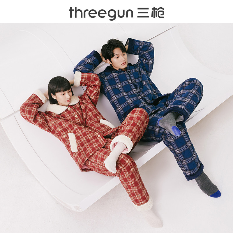 三枪睡衣男秋冬三层加厚夹棉开衫翻领情侣加厚长袖女家居服套装