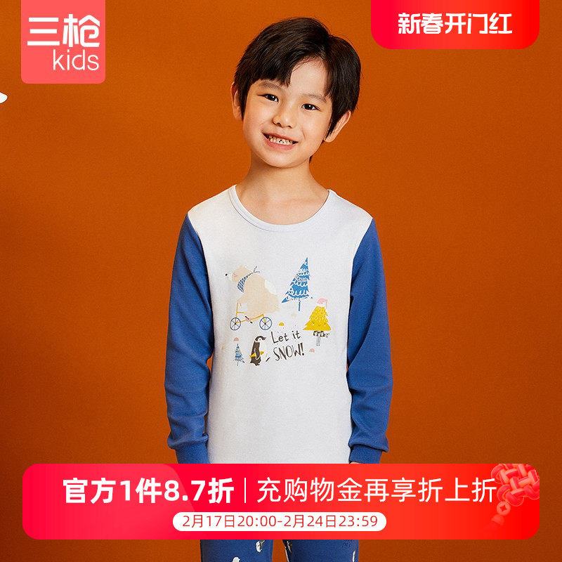 三枪儿童睡衣秋冬全棉男女童秋衣秋裤保暖内衣套装纯棉圆领棉毛衫