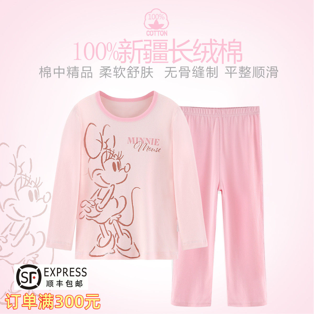 迪士尼新疆纯棉女童圆领长袖睡衣三枪内衣女孩卡通米妮家居服套装